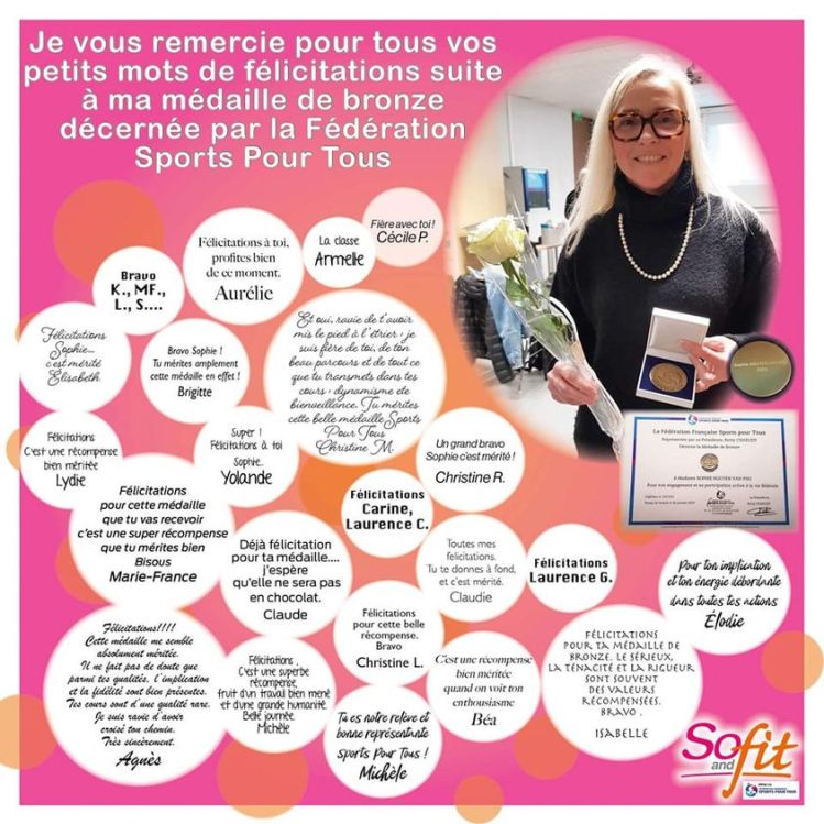 J’ai reçu ce vendredi 10 février, de la part du Comité départemental Sports Pour Tous de la Marne, la médaille de bronze, pour mon partage des valeurs fédérales et mon implication au sein de Soandfit !